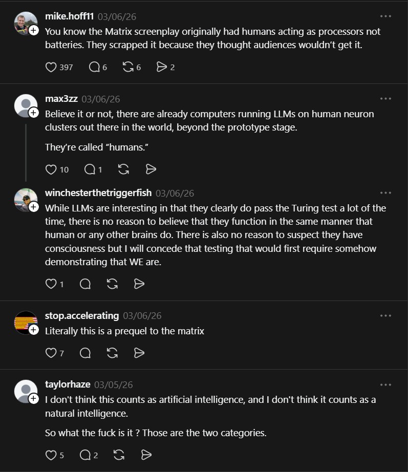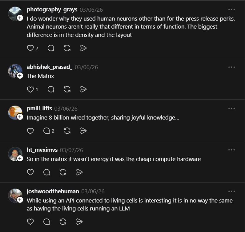 This is research code not production tooling. The CL1 costs $35,000 and needs biological maintenance. The interface demonstrates a concept rather than replacing GPU inference. Some argue the neurons influence rather than truly compute. The philosophical implications may outweigh practical applications today.