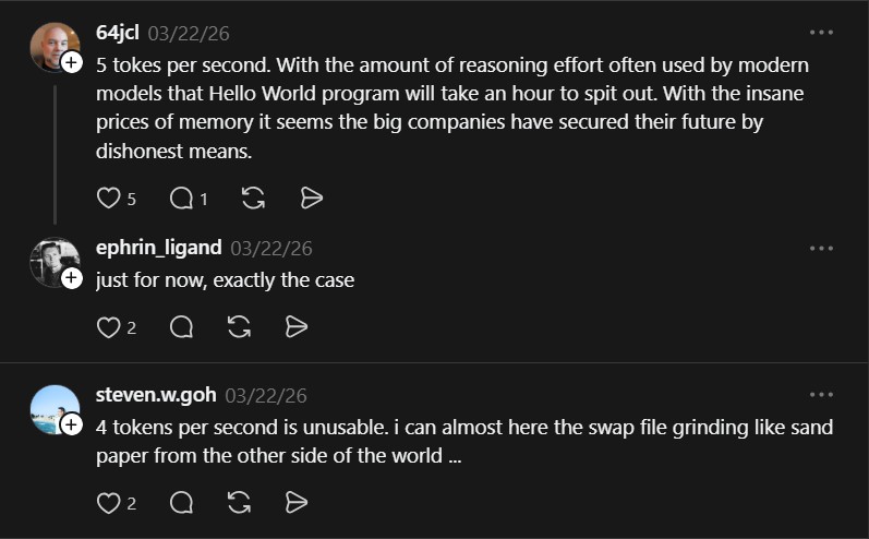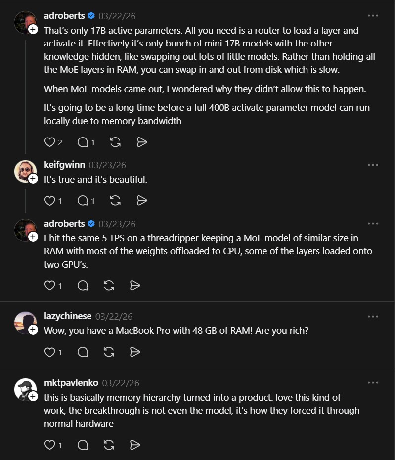 Community reactions highlight the significance of this approach. One user notes that flash-moe turns memory hierarchy into a product. Another observes that only active parameters need to be loaded, enabling large models on limited RAM.