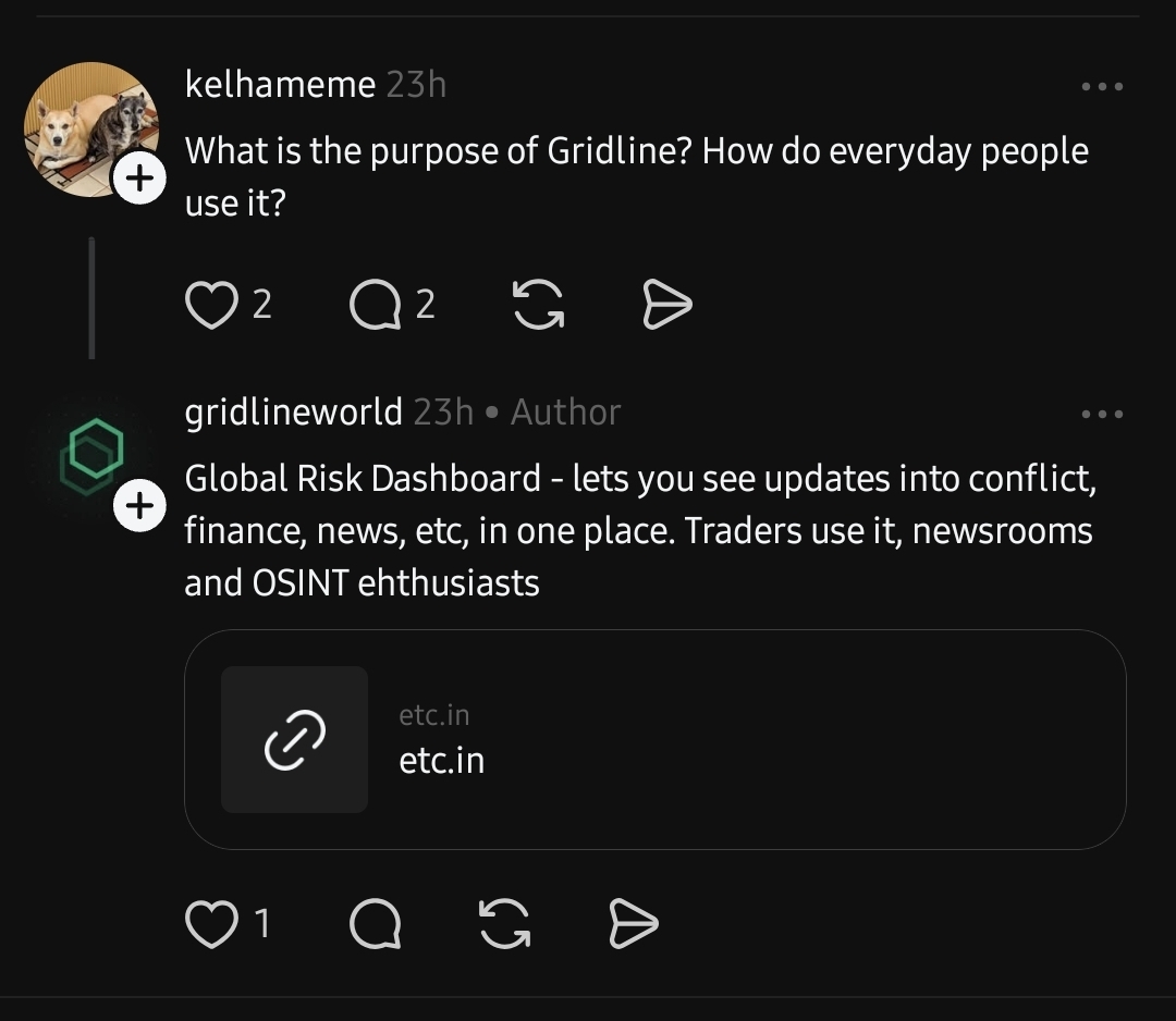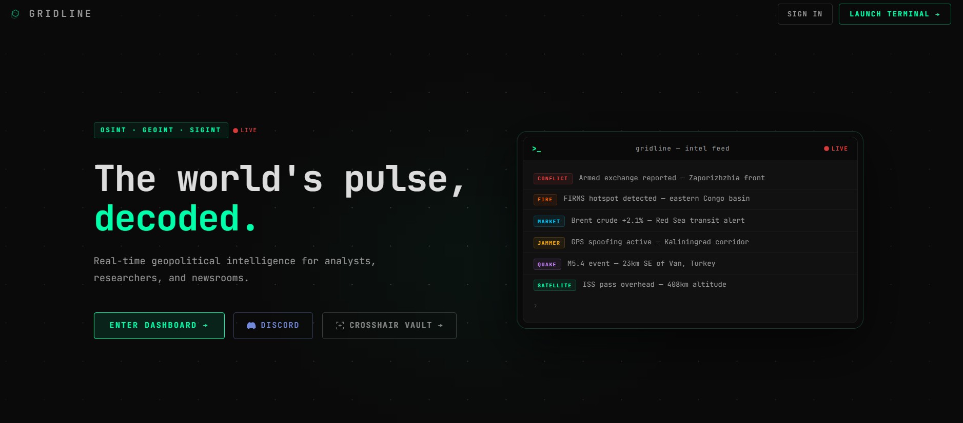 Gridline aggregates public and licensed sources into a single dashboard. You can inspect updates, compare regions, and follow live developments without jumping between tabs. It serves as a lightweight alternative for fast situational awareness.