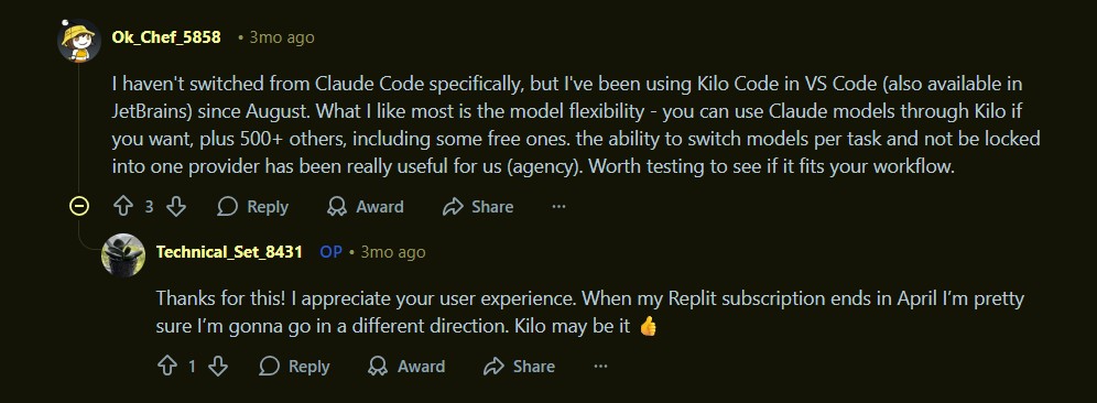 Kilocode excels at unified coding assistance with cost-aware design. It delivers practical AI agent workflows for development teams. The platform’s model flexibility and multi-mode approach reduce reliance on single providers.