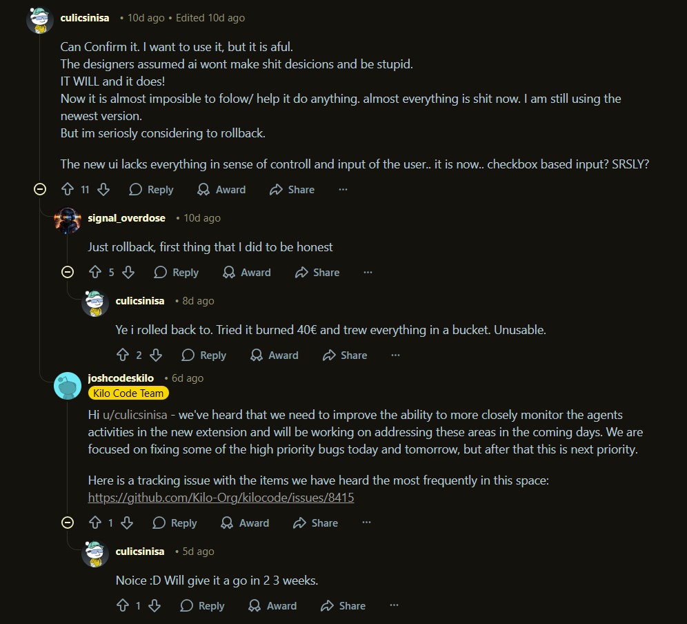 The catch lies in rapid iteration cycles. Some users report UI changes that disrupt established workflows. For personal coding assistant scenarios, consider Cline or Agent Zero. Kilocode is optimized for professional development environments requiring production-grade coordination.