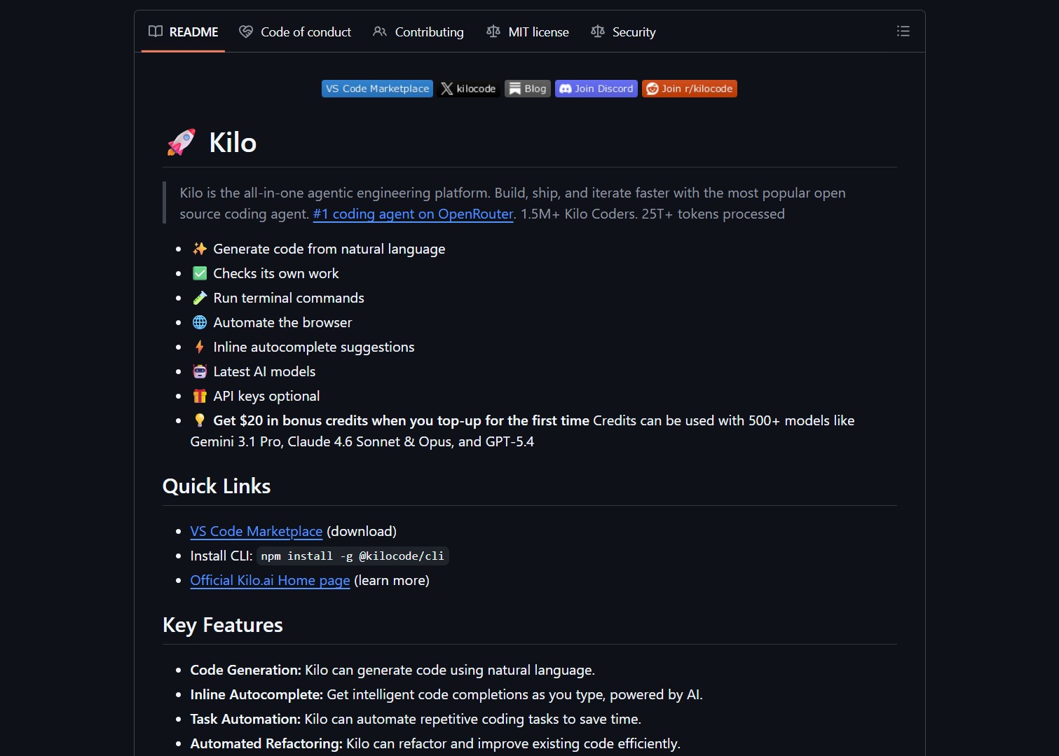 Kilocode operates as an extension for VS Code and JetBrains IDEs. It provides multi-mode workflows for planning, coding, and debugging phases. Users can start without API keys and receive bonus credits for model access.