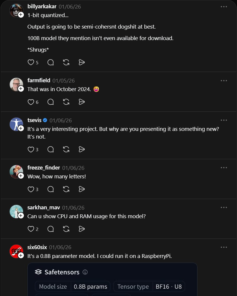 Community responses point out significant discrepancies in the 100B model claims. Critics note the actual available model is closer to 0.8B parameters, not 100B. Output quality at 1-bit quantization is questionable, with some calling it “semi-coherent dogshit at best.” The 100B model mentioned in the paper is not available for download.