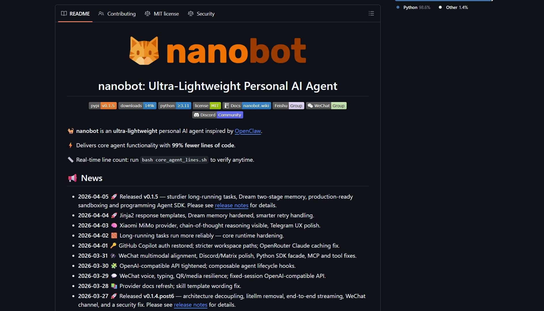 Nanobot is a minimal, research-friendly agent framework from HKUDS that focuses on readability, speed, and low resource usage. The repository demonstrates a compact core agent loop, real-time tooling to count lines (core_agent_lines.sh), and ergonomics that make the codebase approachable for researchers and engineers.
